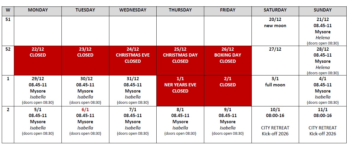 During the Christmas and New Year holidays we have special opening hours. You can see the preliminary schedule below. If you're working week 1 and 2 and have to be early at the office, you may come for self-practice before the mysore class the days we are open. The shala opens 06:45 for self-practice, but teaching only starts at 08:45.