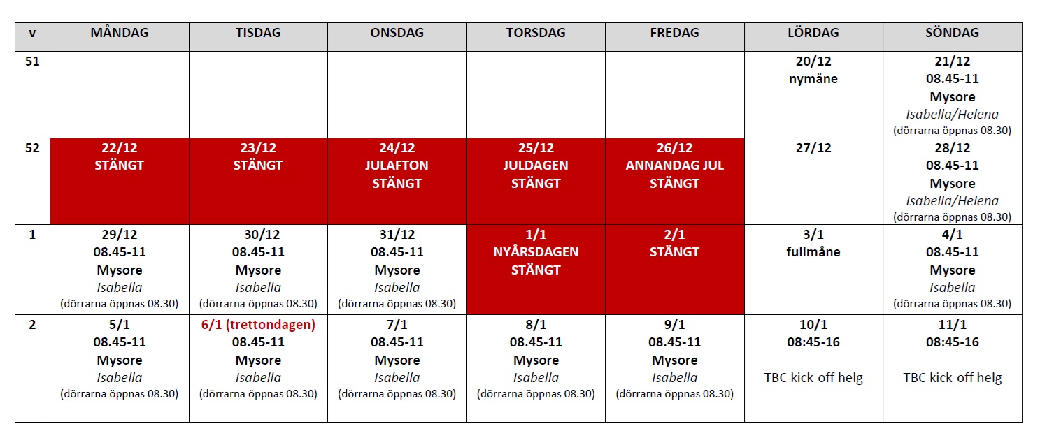 - Morgonmysore slutar kl 08.30 på vardagar och self-practice/egenträning kl 09.45 (vi ber er vara klara och duschade då).